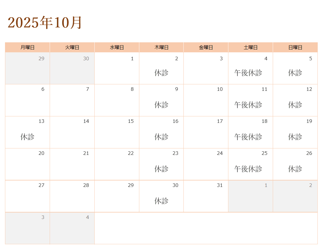 10月休診のお知らせ 2025年9月30日 最終更新日時 : 2025年10月1日 nishikawadc いつも西川歯科医院をご利用いただきありがとうございます。10月の診療を以下の予定で休診とさせていただきます。ご不便をおかけしますが、何卒ご理解のほどお願い申し上げます。