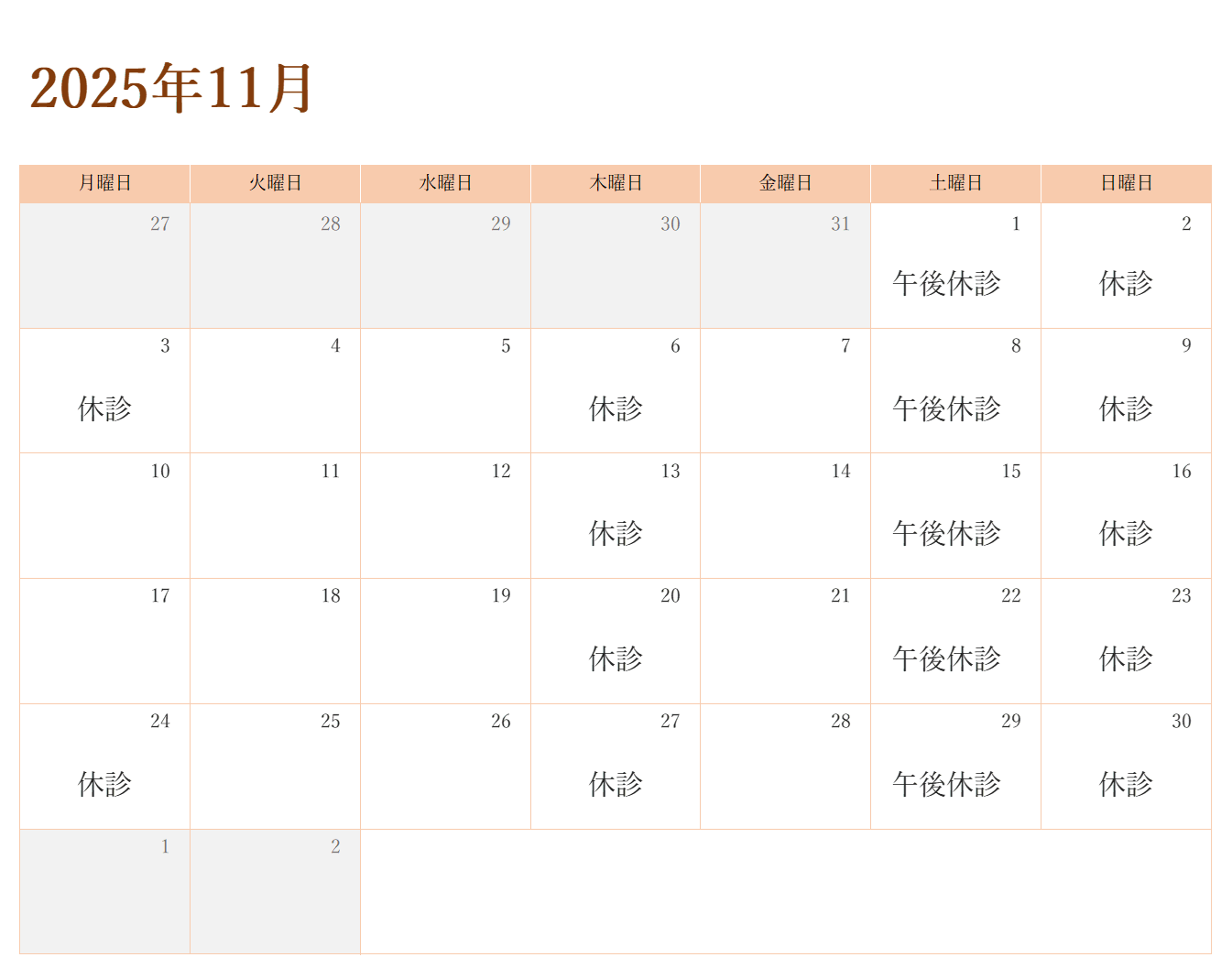 11月休診のお知らせ 2025年10月31日 最終更新日時 : 2025年11月1日 nishikawadc いつも西川歯科医院をご利用いただきありがとうございます。11月の診療を以下の予定で休診とさせていただきます。ご不便をおかけしますが、何卒ご理解のほどお願い申し上げます。